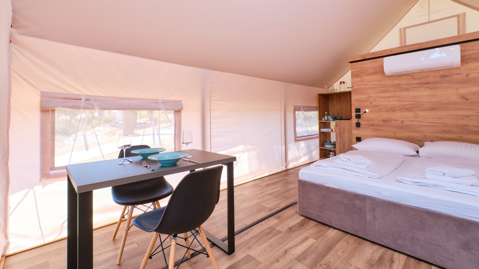 Eine Neuheit auf dem Campingplatz Čikat sind unsere eigenen Glamping-Zelte, die sich in einer der attraktivsten Lagen auf dem Campingplatz, nur wenige Schritte vom Meer entfernt, befinden. Genießen Sie mit Ihren Kindern und Ihren Lieben alle Vorteile eines Familienurlaubs auf einer Insel, und zwar im Freien - genießen Sie die Nähe zum Meer, das moderne Design, die geräumige und gemütliche Einrichtung, die dem Camping-Erlebnis einen Hauch von Glamour verleihen, ganz wie ein Hotelzimmer. Verbringen Sie Ihren Urlaub in einem unserer neuen Glamping-Zelte, im Schatten des jahrhundertealten Parkwaldes Čikat, und genießen Sie den Blick aufs Meer von Ihrer eigenen Glamping-Zeltterasse aus.