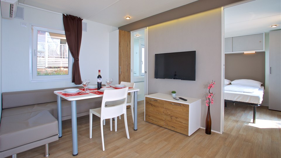 - Namestitev v popolnoma opremljeni mobilni hiški tipa C, A, I ali Freedhome z možnostjo gretja.